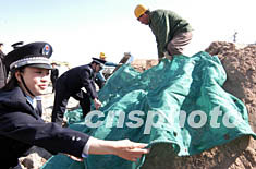 二月二十五日,北京再次刮起六級大風,朝陽城市管理監(jiān)察大隊太陽宮分隊對轄區(qū)內部分施工工地的“揚沙、粉塵”現象檢查,監(jiān)督施工部門嚴密覆蓋裸露土渣,減少對空氣的污染。中新社記者:任海霞