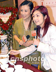 藝人汪明荃2月25日在香港電臺(tái)出席由香港電臺(tái)及香港防癌會(huì)合辦的《汪明荃愛心演唱會(huì)》記者會(huì),歌星楊千嬅特別送上補(bǔ)湯向“阿姐”汪明荃打氣。