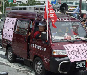游行自下午1時(shí)許開(kāi)始,參加民眾分乘160多輛汽車,車上插著旗幟、貼著標(biāo)語(yǔ),上書“愛(ài)中華,反‘臺(tái)獨(dú)’,反戰(zhàn)爭(zhēng),要和平”、“拒領(lǐng)公投票,否決違法公投”等字樣。車隊(duì)從中華路與成都路交界處出發(fā),浩浩蕩蕩穿行臺(tái)北市區(qū)主要街道,最后匯集到臺(tái)灣當(dāng)局領(lǐng)導(dǎo)人的辦公場(chǎng)所前。游行民眾在這里高喊口號(hào),書寫標(biāo)語(yǔ),表示抗議。