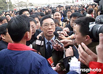 下午二點(diǎn)多,距全國(guó)政協(xié)十屆二次會(huì)議開(kāi)幕尚有半個(gè)小時(shí),但人民大會(huì)堂前已聚滿海內(nèi)外記者,各路英雄架起長(zhǎng)槍短炮,敬候“獵物”。