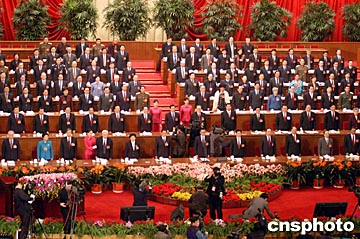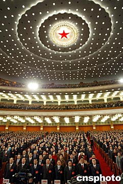 上午九時(shí)整,在熱烈的掌聲中,胡錦濤、江澤民、吳邦國(guó)、溫家寶、賈慶林、曾慶紅、黃菊、吳官正、李長(zhǎng)春、羅干等中國(guó)領(lǐng)導(dǎo)人步入會(huì)場(chǎng)。大會(huì)執(zhí)行主席、主席團(tuán)常務(wù)主席吳邦國(guó)宣布大會(huì)開(kāi)幕。
