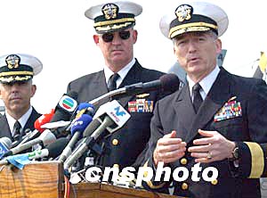 美國太平洋第七艦隊戰(zhàn)斗群司令凱利(右一)在“小鷹”號航空母艦舉行的歡迎儀式上,向媒體介紹該有關(guān)情況及回答記者問。作者:錢興強
