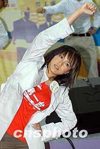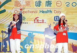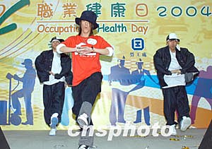 歌星何韻詩3月6日在香港出席由職安局及勞工處舉辦之《職安健康日2004》開幕典禮活動,「職安領隊」何韻詩帶領出席嘉賓及歌星進行健康操,宣揚職業(yè)安全信息。作者:鄧慶樂
