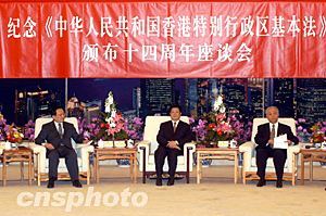盛華仁說,香港基本法頒布十四年來的歷史表明,這部法典的偉大意義在于,它把鄧小平關(guān)于“一國兩制”的偉大構(gòu)想,用法律形式完整地體現(xiàn)出來,并在香港成為事實。依照基本法所開創(chuàng)的“一國兩制”的生動實踐,是世界歷史上前所未有的偉大創(chuàng)舉。事實證明,香港基本法是香港長期繁榮穩(wěn)定的根本保證。