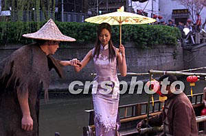 三月十四日,“古鎮(zhèn)西塘”2004年國(guó)際旅游小姐大賽中國(guó)區(qū)總決賽在西塘古鎮(zhèn)新搭建的水上舞臺(tái)進(jìn)行大賽前的整體排練,三十二位參賽佳麗逐個(gè)乘坐烏蓬船登上舞臺(tái)。中新社記者:盛佳鵬
