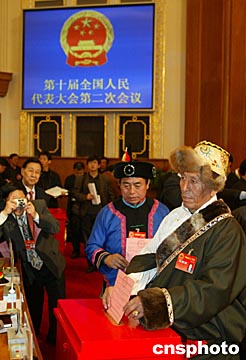 十屆全國人大二次會(huì)議三月十四日在北京人民大會(huì)堂舉行閉幕式,藏族人大代表投票表決“憲法修正案草案”。中新社記者:毛建軍