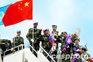 2004年3月16日上午10時30分,沈陽桃仙國際機場一架滿載70名維和部隊先遣隊官兵的專機起飛,直飛福州與那里的維和部隊汽車連會合共同組隊經(jīng)法國飛抵利比里亞首都。三月底由沈陽軍區(qū)派遣的維和工程兵部隊將與先期到達的先遣隊會合,共同完成利比里亞的維和任務。夫子 攝