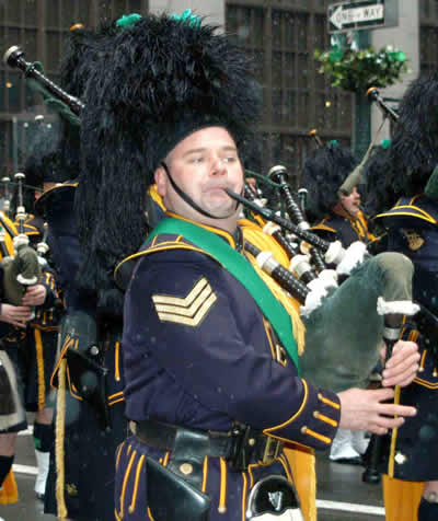 十七日,雖然嚴(yán)寒,卻沒有影響紐約愛爾蘭人慶祝節(jié)日的興致,愛爾蘭風(fēng)笛手仍舊穿著花格短裙沿著曼哈頓五大道緩緩行進。引人注目的還有游行隊伍中身著迷彩服的美國戰(zhàn)士,這是往年并不多見的一只隊伍,美伊戰(zhàn)爭后,這只隊伍成為美國愛爾蘭裔人的驕傲。