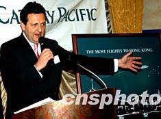 香港國泰航空公司美洲高級副總裁韋棟當(dāng)?shù)貢r間三月十八日率領(lǐng)多名高層管理人士從洛杉磯東進(jìn)紐約,為將于今年七月一日正式啟動的香港--紐約直飛航線作熱身宣傳。作者:趙海燕