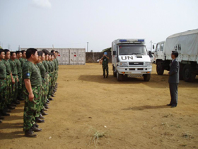 在歡迎儀式上,林大使向維和人員簡(jiǎn)要介紹了當(dāng)?shù)匦蝿?shì)和中利雙邊關(guān)系情況。指出,中利關(guān)系雖經(jīng)曲折,但兩國(guó)人民向來友好。2003年10月,中利復(fù)交為兩國(guó)開展在各個(gè)領(lǐng)域的友好合作奠定了政治基礎(chǔ)。中國(guó)政府將積極參加利和平進(jìn)程和國(guó)家重建。中方派遣維和人員參加聯(lián)合國(guó)在利維和行動(dòng)就是其中一個(gè)重要舉措。強(qiáng)調(diào),參加聯(lián)合國(guó)維和行動(dòng)是一項(xiàng)光榮而艱巨的任務(wù),希望我駐利維和官兵繼續(xù)發(fā)揮我軍的優(yōu)良傳統(tǒng),充分發(fā)揚(yáng)特別能吃苦、特別能戰(zhàn)斗的精神,不辱使命,展示我軍和平之師、威武之師、文明之師的良好形象,圓滿完成祖國(guó)和聯(lián)合國(guó)賦予的光榮使命,為發(fā)展中利關(guān)系,維護(hù)世界和平做出新的貢獻(xiàn)。