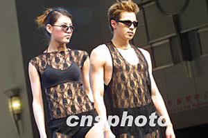 2004高級內(nèi)衣流行趨勢發(fā)布會三月二十二日晚在上海世貿(mào)商城舉行,男女模特展示一款網(wǎng)式情侶內(nèi)衣。作者:湯彥俊