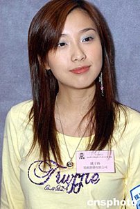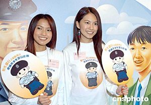 應(yīng)屆港姐冠軍曹敏莉、亞軍楊洛婷(右起)3月23日在香港出席《恒生銀行之協(xié)助警方撲滅青少年罪行比賽2004》揭幕儀式。作者:鄧慶樂(lè)