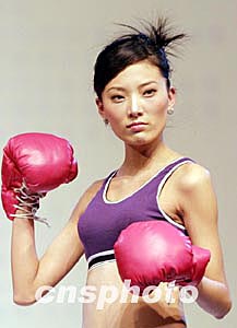 2004高級(jí)內(nèi)衣流行趨勢(shì)發(fā)布會(huì)三月二十二日晚在上海世貿(mào)商城舉行,一模特身穿運(yùn)動(dòng)型內(nèi)衣、手帶拳套,試圖表現(xiàn)力與美的境界。 湯彥俊 攝