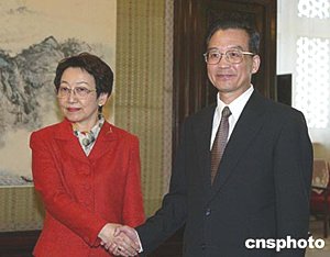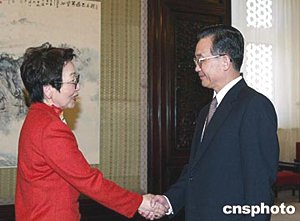 中國(guó)國(guó)務(wù)院總理溫家寶四月三日在北京中南海會(huì)見(jiàn)日本外相川口順子。中新社記者:滿(mǎn)會(huì)喬