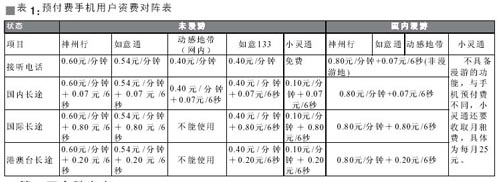 預(yù)付費(fèi)用戶分未漫游(在北京市內(nèi)使用)和漫游(在國內(nèi)其他地區(qū)使用)兩類收費(fèi)標(biāo)準(zhǔn)。具體資費(fèi)標(biāo)準(zhǔn)見表1。