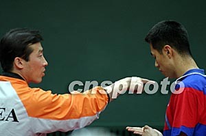 四月十日晚在北京海淀體育館舉行的奧運會乒乓球亞洲區(qū)預(yù)選賽中,中國小將王皓以4-1戰(zhàn)勝韓國選手朱世赫。圖為金澤洙在場邊為朱世赫進行現(xiàn)場指導(dǎo)。中新社記者:盛佳鵬