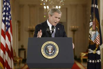 布什在記者招待會(huì)上表示,什葉派穆斯林領(lǐng)導(dǎo)人薩德爾組織了一支非法武裝,并與恐怖組織哈馬斯和黎巴嫩真主黨有關(guān)聯(lián)。