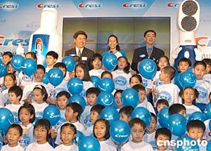 4月14日,著名口腔護理品牌Crest在香港推廣「健康牙齒 美麗笑容」宣傳活動,歌影紅星莫文蔚在活動中率領眾多小學生,一同宣誓成為《Crest笑容大使》,立志保持牙齒健康。作者:鄧慶樂