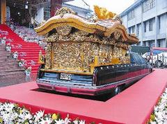中新網(wǎng)4月15日電 臺灣的一家殯葬業(yè)者日前推出造價3600萬元新臺幣的黃金宮殿靈車,車體是加長型的凱迪拉克,上方的宮殿、雕飾品都覆上金箔,租金一天10萬元。據(jù)說已有金融業(yè)及電子業(yè)名人家屬向業(yè)者詢問,打算為長輩預(yù)訂黃金靈車。