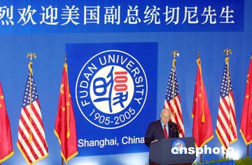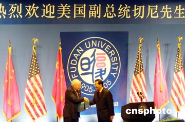 中新網(wǎng)4月15日電 正在上海訪問(wèn)的美國(guó)副總統(tǒng)切尼今天上午在復(fù)旦大學(xué)發(fā)表演講時(shí)說(shuō),如今,中國(guó)已經(jīng)邁步走向一個(gè)偉大的征途,美國(guó)歡迎中國(guó)取得的長(zhǎng)足進(jìn)步。