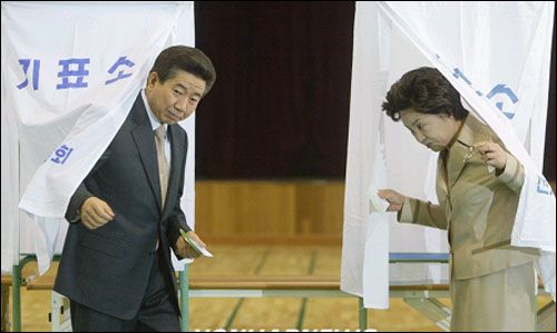 中新網4月15日電 據(jù)韓國媒體報道,韓國第17屆議會選舉15日上午6時起在全國13167個投票所同時進入投票,并在平靜的氣氛中順利進行。韓國總統(tǒng)盧武鉉也于當天偕妻子參加了投票。