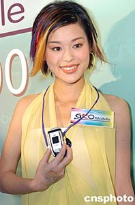 藝員胡杏兒4月16日在香港出席韓國GEO Mobile最新推出的潮流手機(jī)GC800發(fā)布會(huì),胡杏兒為GEO Mobile代言人,以嶄新彩色駁發(fā)形象,與兩位人體彩繪舞蹈員共同展示GC800新手機(jī)。作者:鄧慶樂