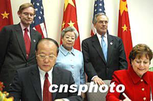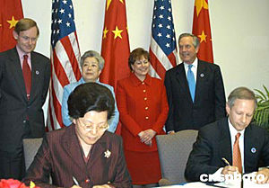 中美在四月二十一日結(jié)束的第十五屆中美商貿(mào)聯(lián)委會(huì)上,就“高技術(shù)出口最終用戶訪問”達(dá)成協(xié)議,這將推動(dòng)美國(guó)對(duì)華高科技出口。圖為中國(guó)商務(wù)部副部長(zhǎng)馬秀紅(左)與美國(guó)商務(wù)部副部長(zhǎng)杰斯特(右)在簽字。作者:余東暉