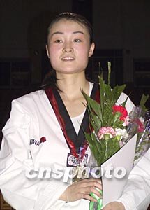二○○四年全國跆拳道錦標賽暨奧運會資格選撥賽四月二十一日晚在海南海口體育館舉行五十九公斤級決賽,曾獲得世界冠軍的解放軍隊選手王朔,獲得五十九公斤級冠軍,并獲得雅典奧運會參賽資格。作者:王辛莉