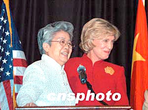 中國(guó)副總理吳儀22日晚上向美國(guó)政界工商界發(fā)表入情如理的演講,受到好評(píng)。演講后,主持人、美國(guó)美國(guó)前商務(wù)部長(zhǎng)芭芭拉.富蘭克林(右)稱贊吳儀演講“沒有一句廢話”。中新社記者:余東暉