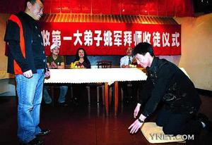 正式的拜師儀式簡短、熱烈,擲地有聲的三叩首表達(dá)了徒弟歸于師父門下的誠意,隨后,師徒二人互贈紀(jì)念品,徒弟將金畫《雄鷹展翅》贈予師父,而師父則將自己的小品專輯以及電視劇《正月里來是新春》的光碟回贈給徒弟,目的是希望他今后堅(jiān)持演文明戲,演有尊嚴(yán)、有人格的作品,做一個(gè)德藝雙馨的藝人。