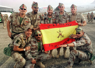4月28日,248名西班牙最后一批駐伊作戰(zhàn)士兵乘飛機(jī)從科威特回國。圖為駐伊拉克的西班牙士兵到達(dá)西班牙西南部的Badajoz后與一面軍旗合影。