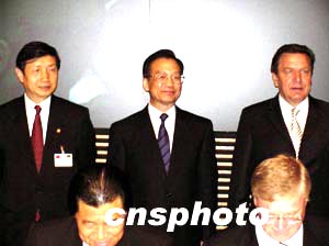 中國總理溫家寶四日上午參加在柏林召開的中德高技術(shù)對話論壇第三次會(huì)議開幕式時(shí)稱,中德高技術(shù)合作潛力巨大,前景廣闊,中國將采取更有力的措施保護(hù)知識產(chǎn)權(quán)。圖為溫家寶總理(中)和德國總理施羅德出席中德高技術(shù)項(xiàng)目合作簽字儀式。作者:蔚中