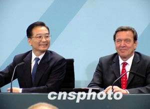 正在德國訪問的中國總理溫家寶三日下午和德國總理施羅德進(jìn)行會(huì)談,并發(fā)表了中德聯(lián)合聲明。圖為兩國總理在會(huì)談后聯(lián)合舉行記者招待會(huì)。作者:蔚中