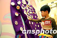 5月6日,香港小朋友在海港城舉辦“母親節(jié)率先表愛(ài)意”活動(dòng),將徽章掛在巨型衣服上,慶祝母親節(jié)。作者:洪少葵
