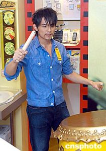 臺(tái)灣人氣偶像歌星周杰倫5月7日在香港出席其代言廣告One2free灣仔新店開幕,周杰倫并以打鼓助慶。作者:鄧慶樂(lè)