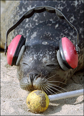 一個正在接受科學(xué)研究的14歲海豹頭戴耳機(jī),樣子憨態(tài)可掬。