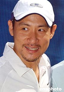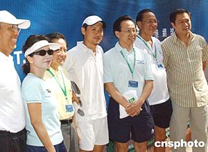 香港影視紅星張學(xué)友與著名音樂人區(qū)丁玉,五月九日代表香港明星隊參加在香港舉行的網(wǎng)球團體邀請賽網(wǎng)球雙打組合。