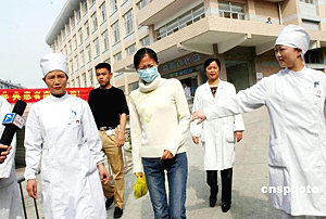 2004年5月10日上午,安徽首例非典確診患者宋某走出安徽醫(yī)科大學第一附屬醫(yī)院傳染科病房。該非典確診患者經安徽省和醫(yī)院專家組會診后,認為其已符合傳染性非典型肺炎治愈出院標準。安徽確診非典患者宋某是安徽醫(yī)科大學的女碩士研究生,4月4日由淮南礦工二院轉入安醫(yī)大附院。至5月7日,安徽省SARS患者的全部115名密切接觸者已全部解除隔離醫(yī)學觀察,沒有出現(xiàn)一例異常情況。至此,安徽省已無非典病人及接觸非典而進行隔離醫(yī)學觀察人員。劉兵生 攝