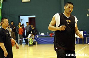 五月十一日,備戰(zhàn)雅典奧運(yùn)會(huì)的中國國家男子籃球隊(duì)在北京進(jìn)行公開訓(xùn)練,剛剛回國的NBA球員巴特爾參加了合練。中新社記者:盛佳鵬