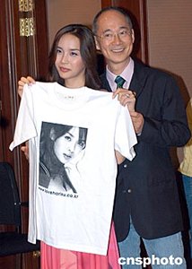 香港唯美派導(dǎo)演楊凡與韓國(guó)影星河利秀展示該片宣傳T恤。作者:鄧慶樂(lè)