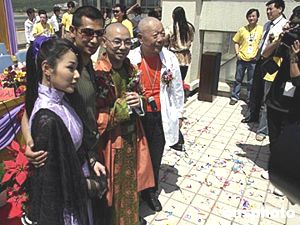 大型古裝荒誕電視劇《御前四寶》5月13日在北京市郊懷柔開機(jī),臺(tái)灣女星鄭儀容,男星趙文卓,大陸著名主持人劉儀偉,香港老牌影星午馬(從左到右)出席開機(jī)儀式。中新社記者:高遠(yuǎn)