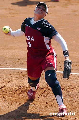 在當地時間8月19日舉行的壘球比賽中,美國隊選手里薩-費爾南德茲使出全身力氣奮力一投。