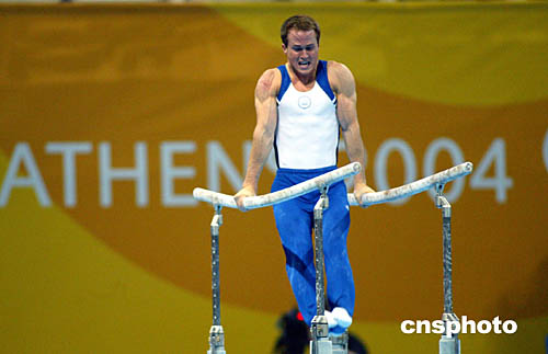 在當(dāng)?shù)貢r(shí)間8月18日舉行的男子體操個(gè)人全能賽中,美國(guó)選手哈姆奪得冠軍。圖為他在雙杠項(xiàng)目上的表現(xiàn)。