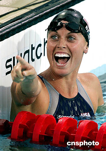 在當地時間8月19日舉行的女子200米蛙泳比賽中美國選手阿曼達-比爾德勇奪金牌。圖為她在得知自己奪冠后歡呼的鏡頭。