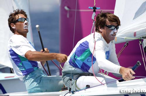 圖為當?shù)貢r間8月18日舉行的男子雙人皮劃艇比賽中,美國選手Paul Foerster和Kevin Burnham。