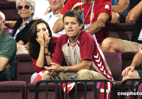 圖為丹麥王儲弗雷德里克攜王妃瑪麗來到奧運比賽現(xiàn)場,觀看當(dāng)?shù)貢r間19日舉行的手球預(yù)賽,該比賽在丹麥與西班牙之間進(jìn)行。