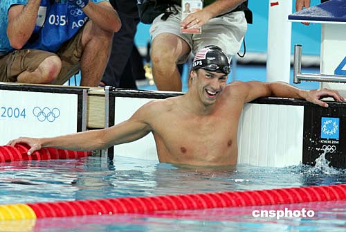 當(dāng)?shù)貢r間八月二十日晚,美國神童菲爾普斯在雅典奧運男子一百米蝶泳比賽中獲得金牌。中新社記者:毛建軍