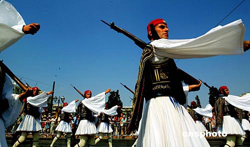 在雅典無名戰(zhàn)士紀念碑前站崗的希臘王家衛(wèi)隊衛(wèi)兵,身著當(dāng)年爭取民族獨立戰(zhàn)爭時期山區(qū)戰(zhàn)士的裝束。成為一名王家衛(wèi)隊衛(wèi)兵是很多希臘青年的夢想。中新社記者:王瑤