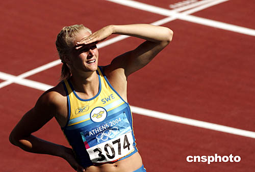 圖為瑞典選手克魯芙特(Carolina Kluft)在七項全能100米欄比賽結(jié)束后,注視記分牌的鏡頭。