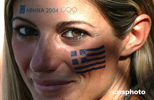 圖為在當(dāng)?shù)貢r(shí)間8月20日舉行的女子50米自由泳比賽中,一位描畫著希臘國旗的支持者來為選手們加油。